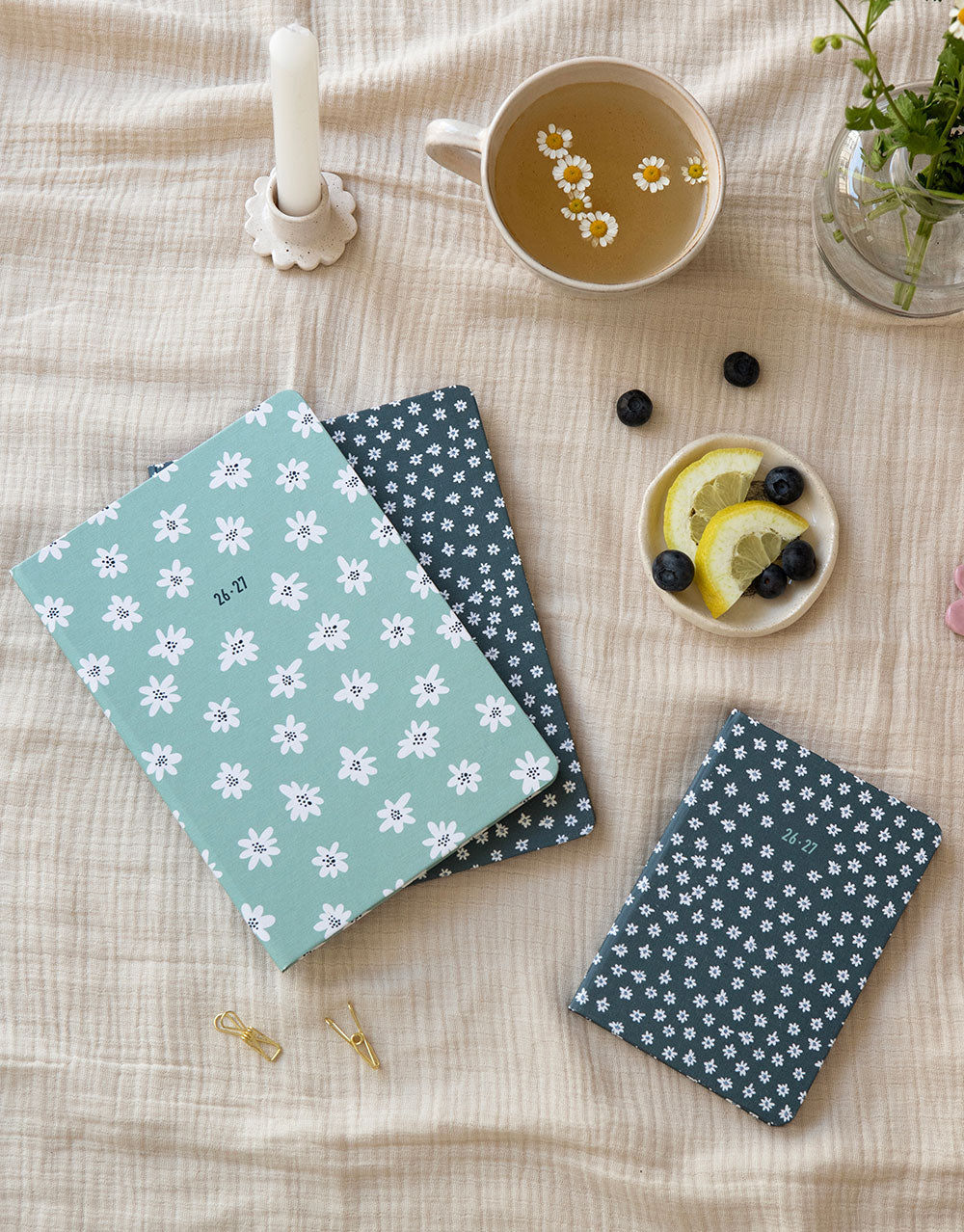 Organise your hopes, goals and to-dos this year with our beautiful case bound 2026-2027 diary in A6 size from the Daisies Collection. Featuring a linen paper cover, illustrated with wild daisies in classic shades of blue or mint & white. Multilanguage week to view diary in English, French, German, Italian, Dutch and Spanish.