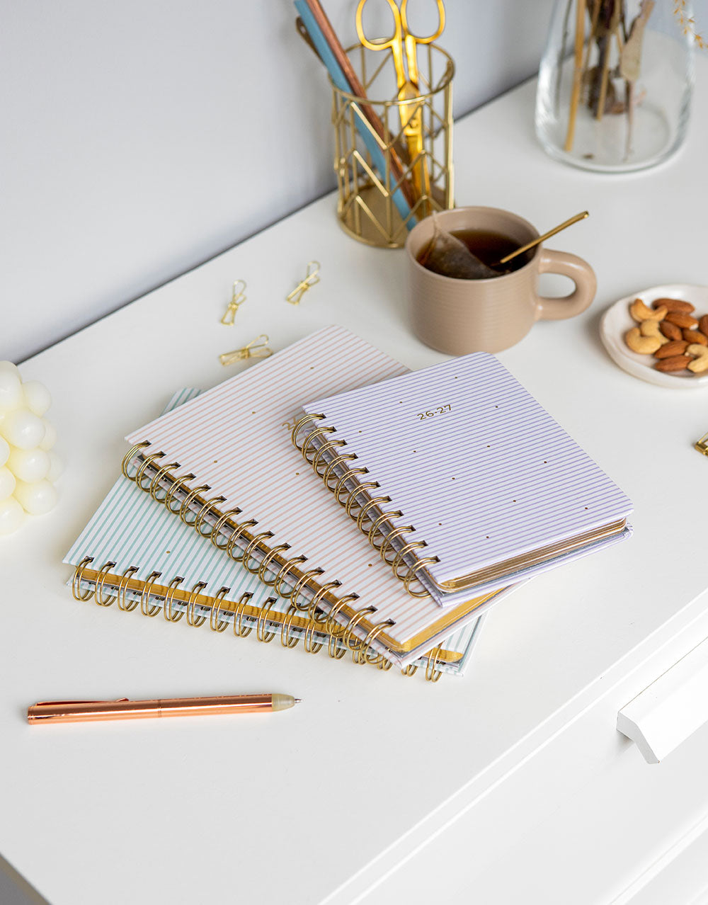 There is nothing more blissful than being on a beach, daydream about your favourite days spent at the seaside with this wiro bound 2026-2027 diary in A5 size from the Stripes Collection. Featuring a stylish striped design with gorgeous gold foil accents on a matt laminated cover.